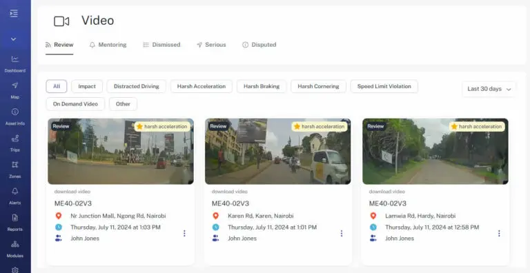 Бъдете информирани за опасно поведение на водачите чрез високорезолюционни снимки и видеа на събитията, заедно с точната локация, в която са се случили, благодарение на флийт телематиката на Trakera.