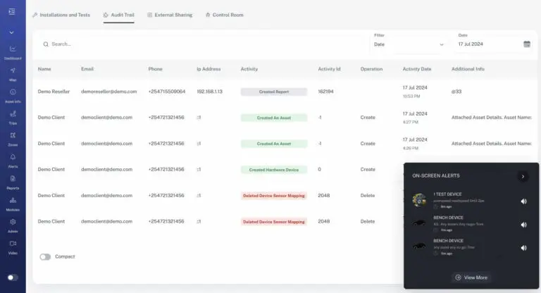 Trakera предоставя данни като локация и адрес в реално време, история на маршрути, известия, отчети за пробег, табла (dashboards) и отчети за управление на автопарка.